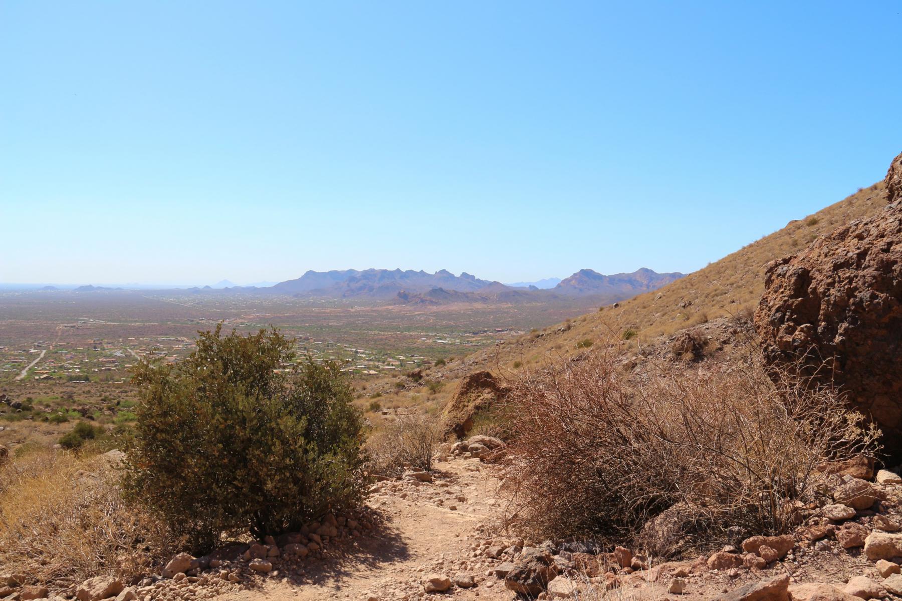 Könnt ihr den Flatiron erkennen? Er erhebt sich wie ein gigantisches Bügeleisen aus den Superstitions. Es handelt sich um die Spitze, die direkt oberhalb des großen Saguaros zu sehen ist! Um Gottes Willen... Das wird ein Gewaltmarsch bei der Hitze.