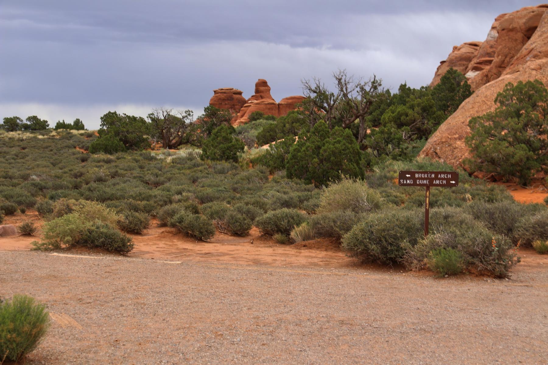 Landscape Arch von der Yellow Flat Area Hier noch nicht loslaufen! (Der Arch ist aufgrund der Entfernung etwas schwer zu sehen. Man findet ihn am Horizont über dem rechten grünen Busch.)