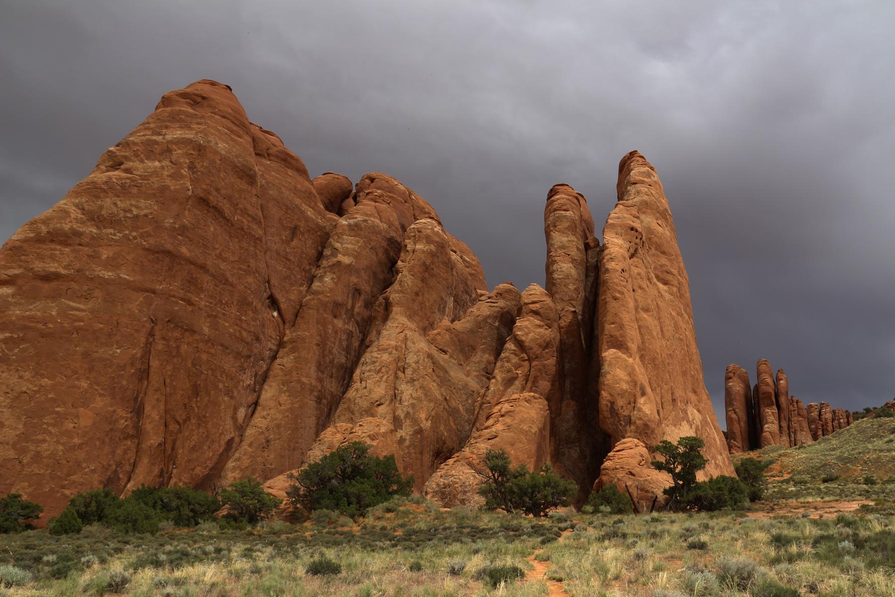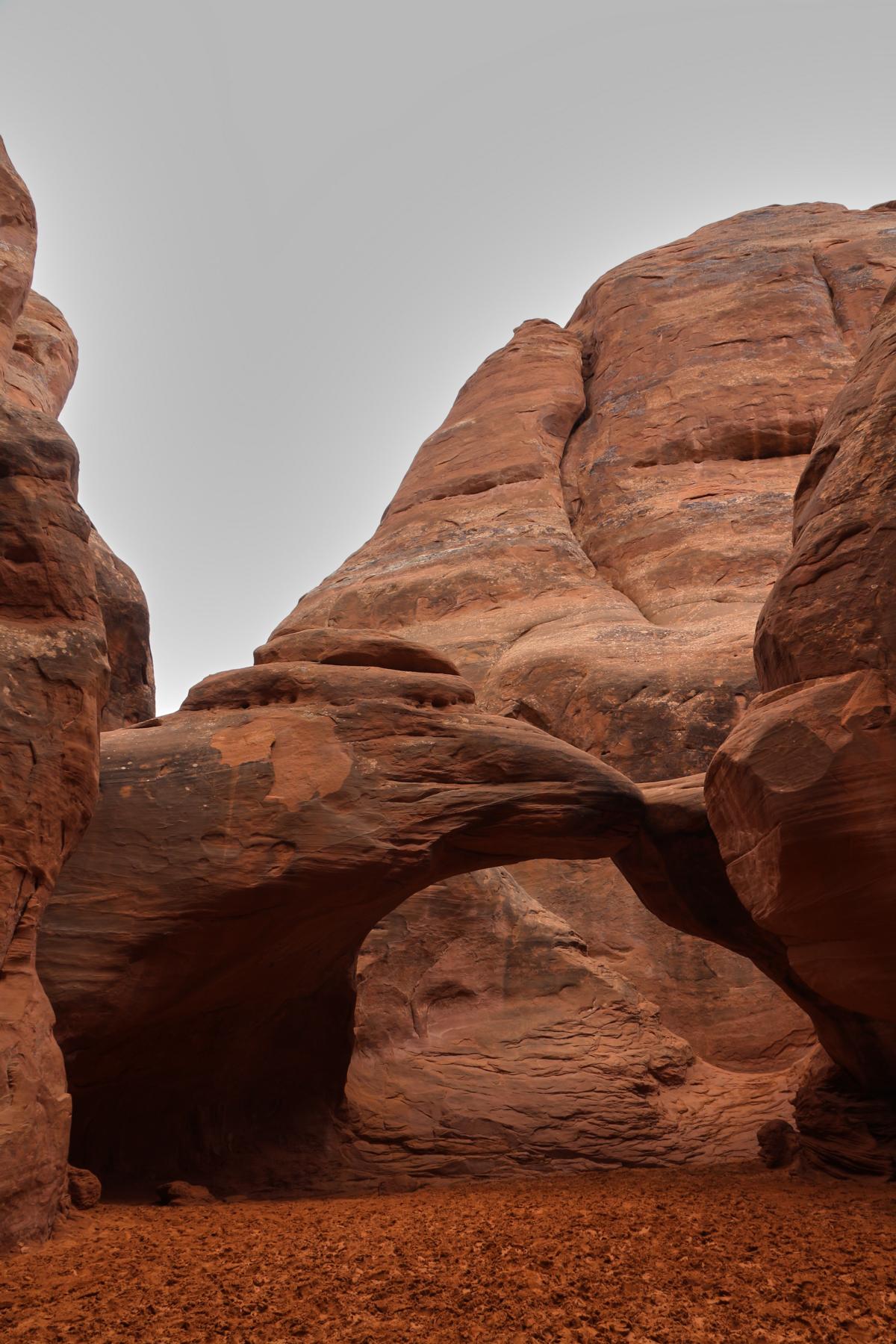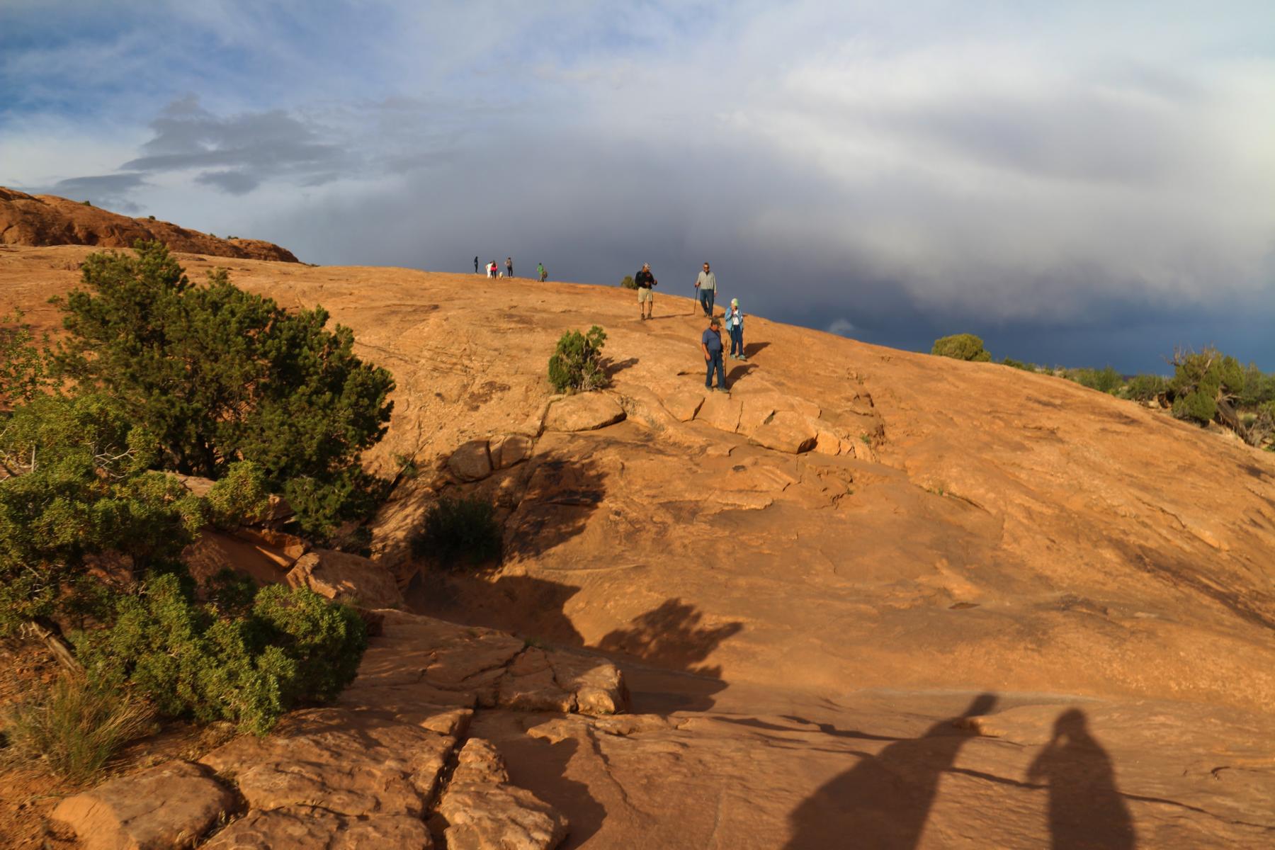 Auch hier ist es wieder komplett anders als damals: Es ist leer! Normalerweise ist am Double O Arch mehr los, denn hier kommt man noch über den "normalen" Trail hin und es ist zugegebenermaßen ja auch ein sehr eindrucksvoller Arch! Aufgrund des Himmels haben sich die meisten Leute aber offensichtlich schon zurückgezogen und auch wir planen nicht, uns hier länger aufzuhalten. Ich glaube, wir sollten ganz schnell gucken, das wir hier weg kommen. Wir begeben uns wieder auf den Main Trail, der direkt hinter dem Arch etwas grenzwertig für Leute mit Höhenangst ist.