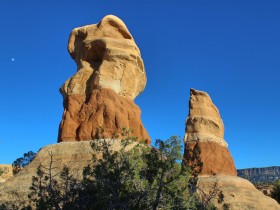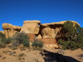 Wir sitzen ziemlich genau eine Stunde lang dort, reden über den heutigen Tag und unsere bisherigen Reiseerlebnisse. Es ist einfach schön, den aufregenden Tag an einem so schönen Ort ausklingen zu lassen. Wir haben jetzt 19:10 Uhr und langsam aber sicher kündigt sich der Sonnenuntergang an, die Tageszeit, die hier im Devils Garden die schönste sein soll. Kati und ich schnappen uns unsere Kameras und machen uns auf eigene Faust auf den Weg über das Gelände, meine Mutter ist ziemlich durch und bleibt bei den Rucksäcken am Tisch. Die Farben im Devils Garden kommen zu dieser Tageszeit richtig gut zur Geltung und es gefällt mir sehr gut hier.