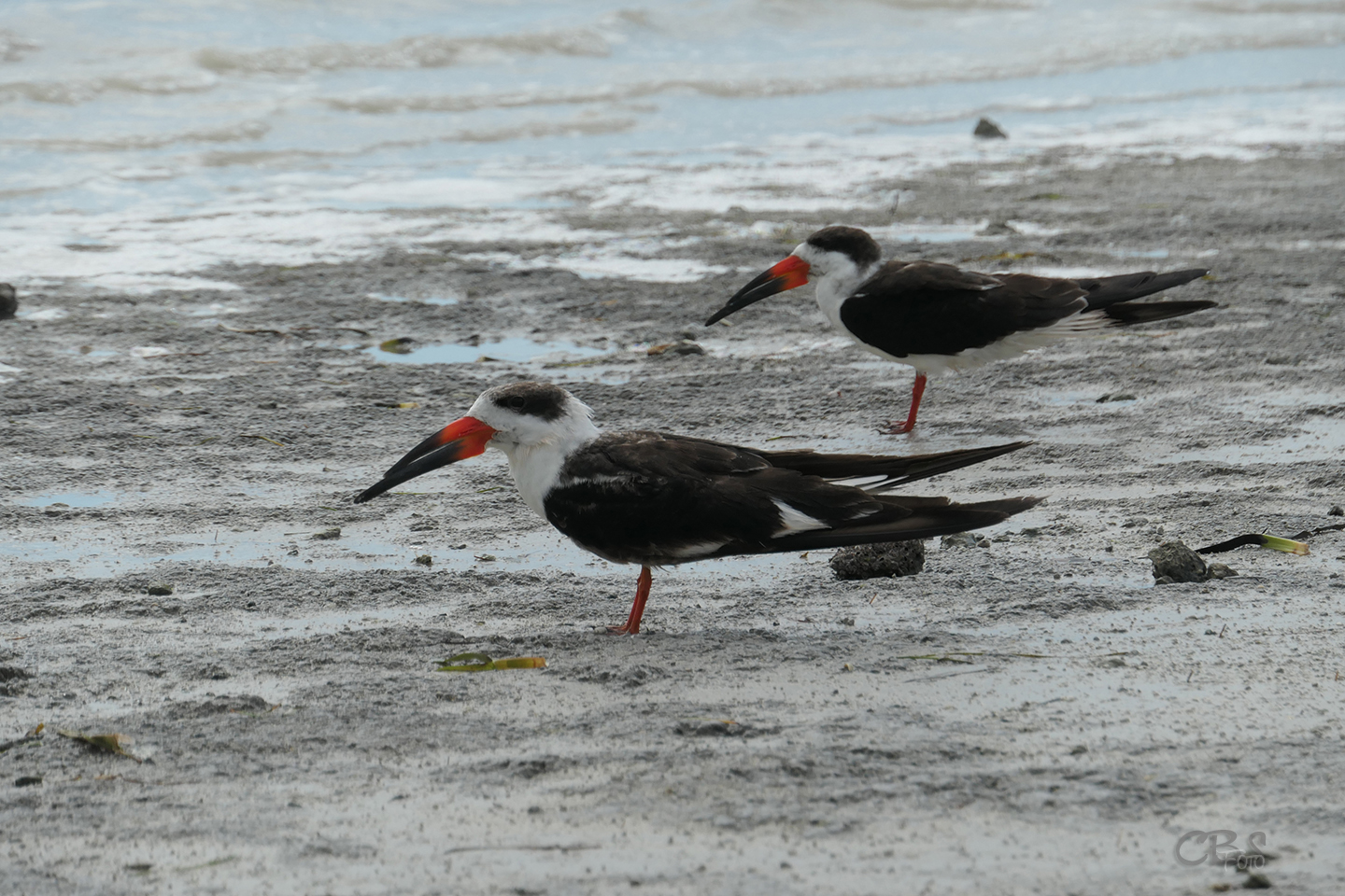 Ein paar Möwen kreischen und am Strand sitzen jede Menge Black Skimmer (Schwarzmantel-Scherenschnabel).