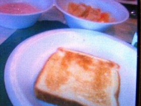 Wir wollten uns gerade aufmachen auf die suche nach dem Frühstück , da kam es auch schon um die Ecke: 1 Tost - Marmelade - Joghurt-Obst , alles in Papptellern . Ein 2. Kaffee war wohl auch nicht vorgesehen , zumindest erfolgte keine Nachfrage.